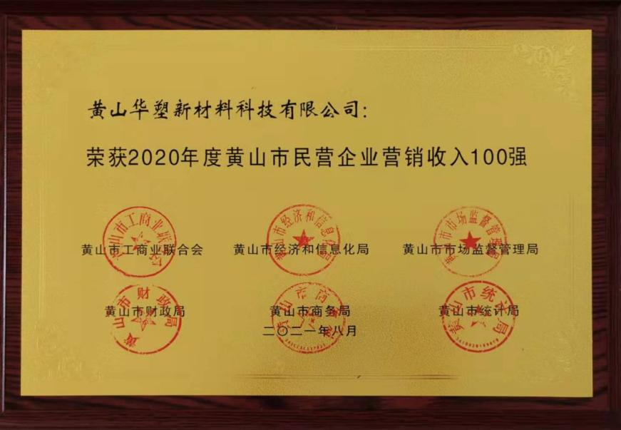 榮獲2020年度黃山市民營企業(yè)營銷收入100強